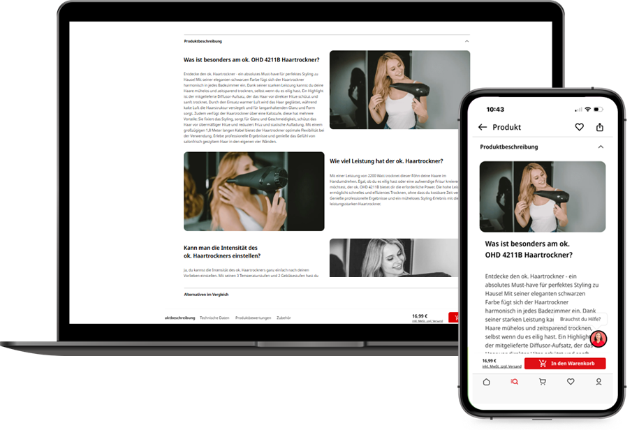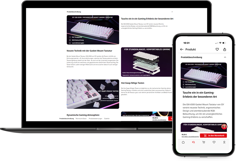 Wir stellen Ihre Inhalte auf den Produktdetailseiten bereit und identifizieren sowie kennzeichnen etwaige Darstellungs- oder Layoutprobleme auf Desktop- und Mobilgeräten, wobei wir die weiteren Schritte mit Ihnen abstimmen.