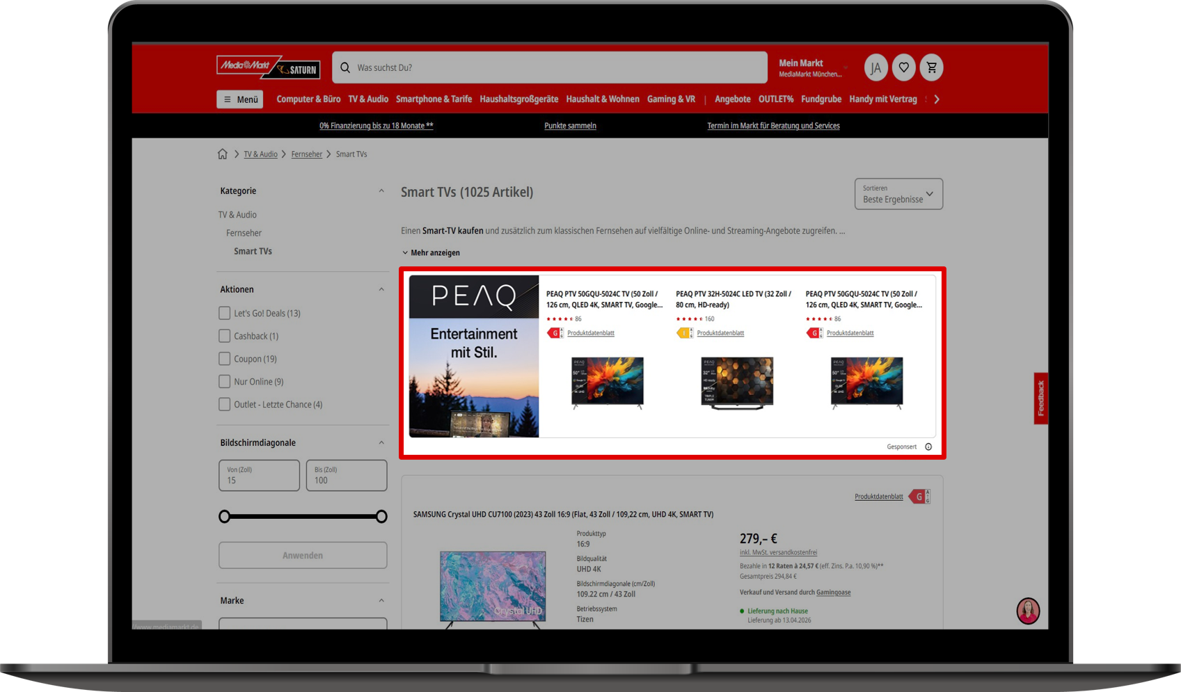 Sponsored Brand Ads (SBA) steigern die Sichtbarkeit Ihrer Marke, indem sie Ihre Marke und Ihr Produktportfolio auf den Seiten der Händler in den Vordergrund rücken – in Unterkategorie-Überschriften, Bannern oben in den Suchergebnissen und auf Produktdetailseiten. SBA zielen auf den mittleren Trichter ab, um die Reichweite zu erhöhen, die Markenerinnerung zu stärken und die Kaufbereitschaft zu fördern. MediaMarktSaturn bietet Pakete mit garantierten Impressionen und maßgeschneiderte Reichweitenprogramme an.